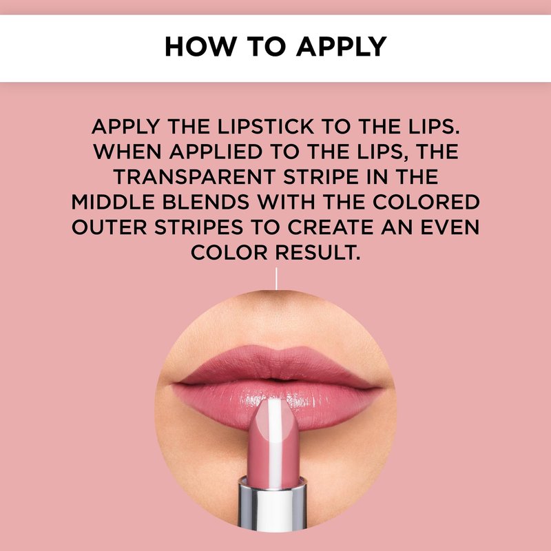 - APPLICATION: Apply the lipstick to the lips. When applied to the lips, the transparent stripe in the middle blends with the colored outer stripes to create an even color result.