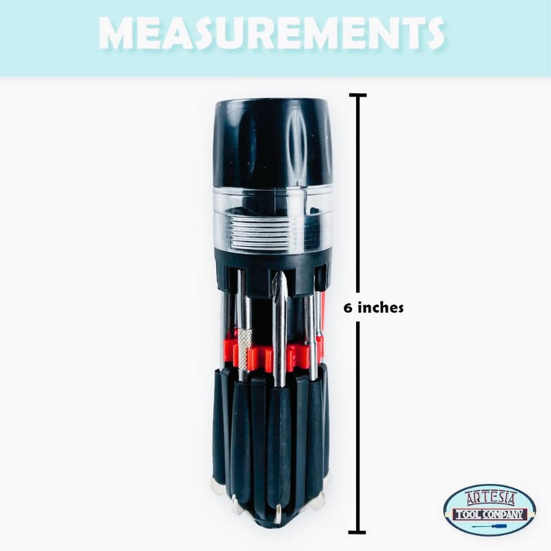 - MULTIFUNCTIONAL DESIGN: A 6" (15.2 cm) unit cleverly combining a flashlight surrounded by 8 screwdrivers for multipurpose utility.