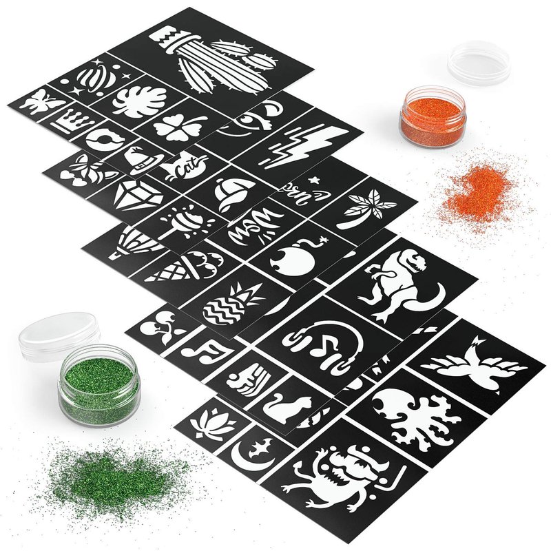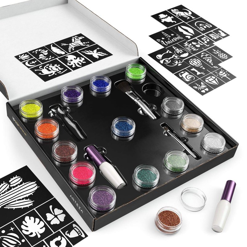 ARTEZA Glitter Tattoo Kit - Body Glitter Tattoo Set Includes 15 Vibrant Colors, 2 Brushes, 2 Glue Applicators and 40 Unique Glitter Tattoo Stencils - Glitter Temporary Tattoos For Kids And Adults