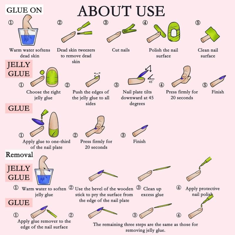 - Continuous wearing time: You Decide!If you want long-lasting results that last longer than 14 days, we recommend using nail glue and adhesive tabs together. If you want to change your design every week then using only adhesive tabs is your best choice, you can also remove the excess adhesive tabs and save it for next time
