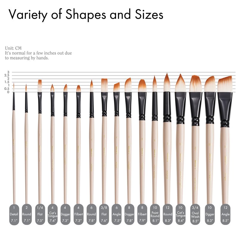 - Variety of Shapes and Sizes: The paint brush set includes 17 brushes in 9 different shapes—round (#2, #6, #12), pointed round (#10), dagger (#4, #8, #10), cat's tongue (#4, #10), filbert (#4, #8), angle (#6, #12), detail (#1), oval wash (3/4"), and flat (1/4", 3/8"). Suitable for artists of all levels, and perfect for various watercolor techniques and artistic expressions
