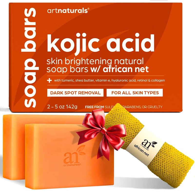Artnaturals Kojic Acid Soap + African Net Sponge (2 pack X 142g Turmeric bars) Dark spot remover & Scars - Original Japanese Complex Vitamin C, Hyaluronic Acid, retinol, shea butter (Citrus)