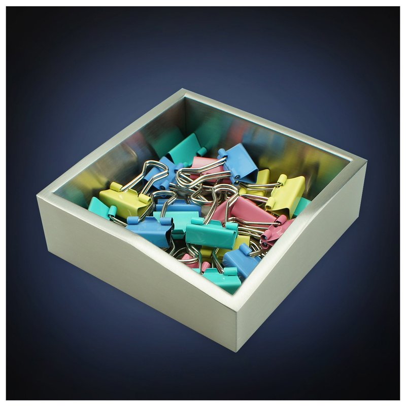 This paper clip holder/dispenser is not only a must-have for any office, but also a work of modern art. It is made of high-quality stainless steel with cutting-edge workmanship. The unique cut-off corner design not only shows the beauty of geometry but also makes it easy to reach for clips, pins, or any small items. In addition to paper clips, it is also suitable for dressmaker pins, safety pins, binder clips, hair clips, and other small items. A secret code is laser engraved at the bottom, which hides important collectible information. Decoding is provided in a small booklet that comes with the product. It has 4 pads on the bottom to prevent scratching. Packed in a gift box, it is a perfect gift for any occasion and is welcomed by professionals such as doctors, lawyers, managers, dealers, executives, secretaries, exhibitors, and others. Please note that clips and pins are not included.