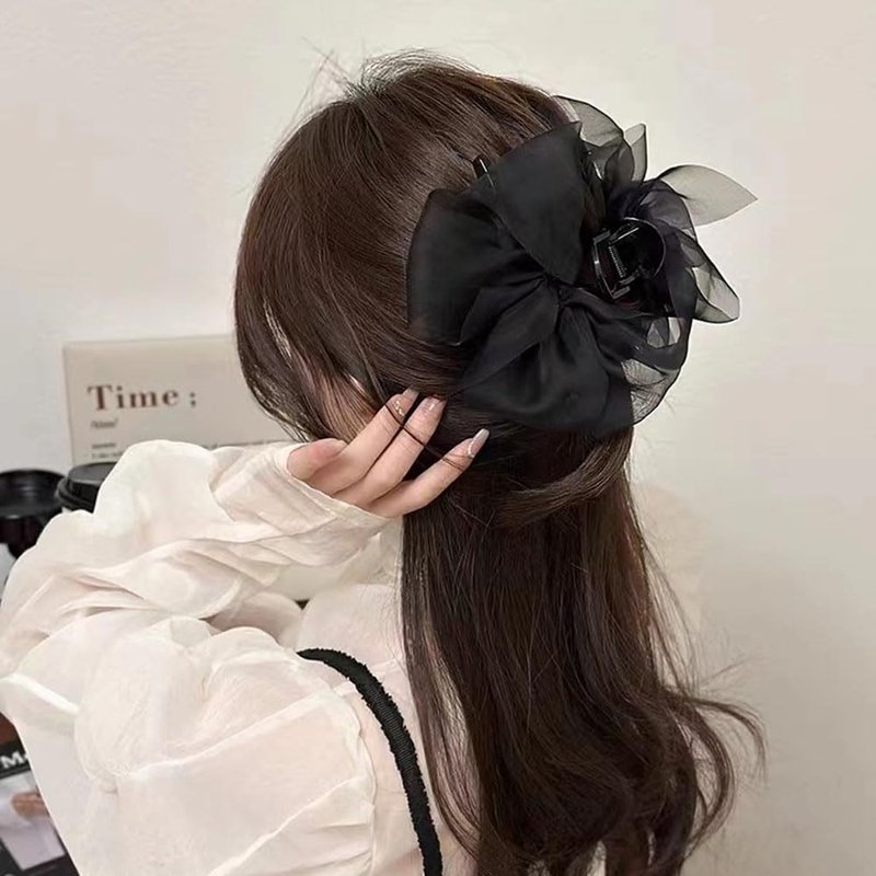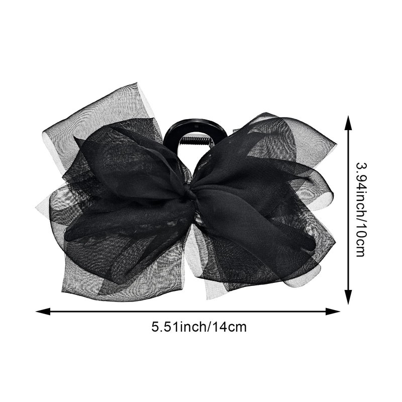 - 【DESIGN】- Black chiffon bowknot hair claw is composed of 3 parts, including a shark hair clip, tulle fabric bows on both sides of the hair clip, and rhinestones embellished in the bow.