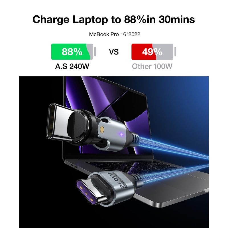 - ๐๐๐๐-๐๐๐๐๐๐ ๐๐๐๐๐: Harness the power of 240W charging and USB Power Delivery Technology. The magnetic charging cable type c your devices swiftly, saving you time and ensuring you're always connected. It can fully charge a Phone 15 96%, a Switch 90%, a Samsung S23 96%, a McBook Pro 86% and an Pad Pro 89% in 35 minutes. No more idling while a battery charges slowly. NOTE: Please be aware that a C port adapter with the appropriate power is required.