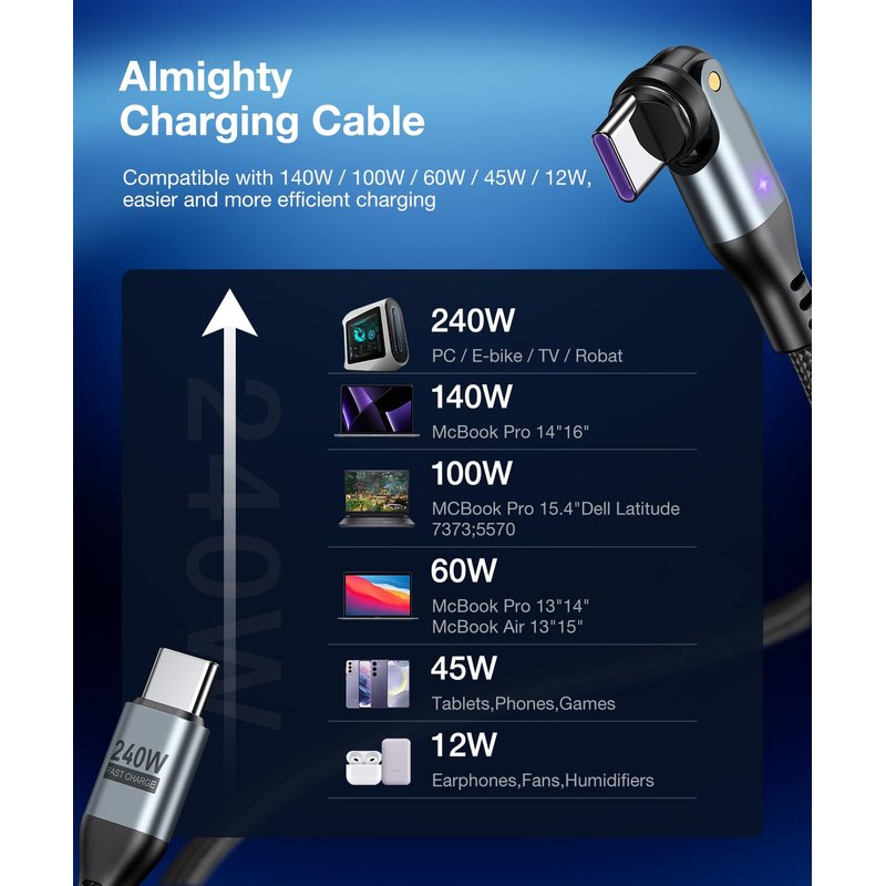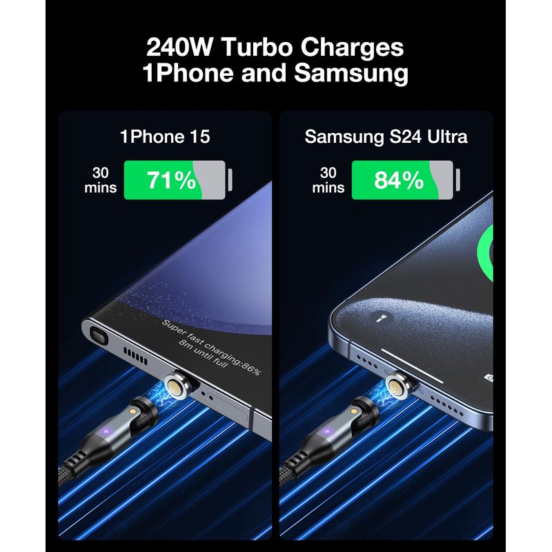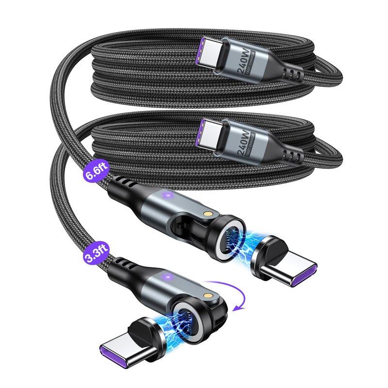 Introducing the 240W Magnetic USB C Charging Cable: High-Power Efficiency: Engineered to deliver a robust 240W of power, this magnetic charger cable is perfect for laptops and other high-capacity devices that demand quick and powerful charging. Universal Compatibility: Seamlessly works with all C-port devices, ensuring that whether you're charging a laptop, smartphone, tablet, or gaming console like STEAM DECK or Switch, you get the best performance. Innovative Magnetic Technology: The magnetic USB charger's smart magnetic connection provides a secure and reliable charge every time, with the added benefit of preventing fraying and wear on your device's charging port. Safety First: Equipped with advanced safety features, our magnetic charging cable includes over-voltage, over-current, and over-temperature protection to safeguard your devices during the charging process. Durable and Compact Design: Crafted with high-quality materials, this magnetic phone cable is both durable and compact, making it easy to carry around and perfect for on-the-go charging. Future-Proof Charging: Stay ahead with a cable that supports the latest fast-charging technologies, ensuring your devices are future-proof and ready for whatever comes next. Embrace the convenience and power of the 240W Magnetic Charging Cable, and say goodbye to the hassle of traditional charging methods. Charge with confidence, knowing your devices are in good hands with our cutting-edge magnetic charger cable.