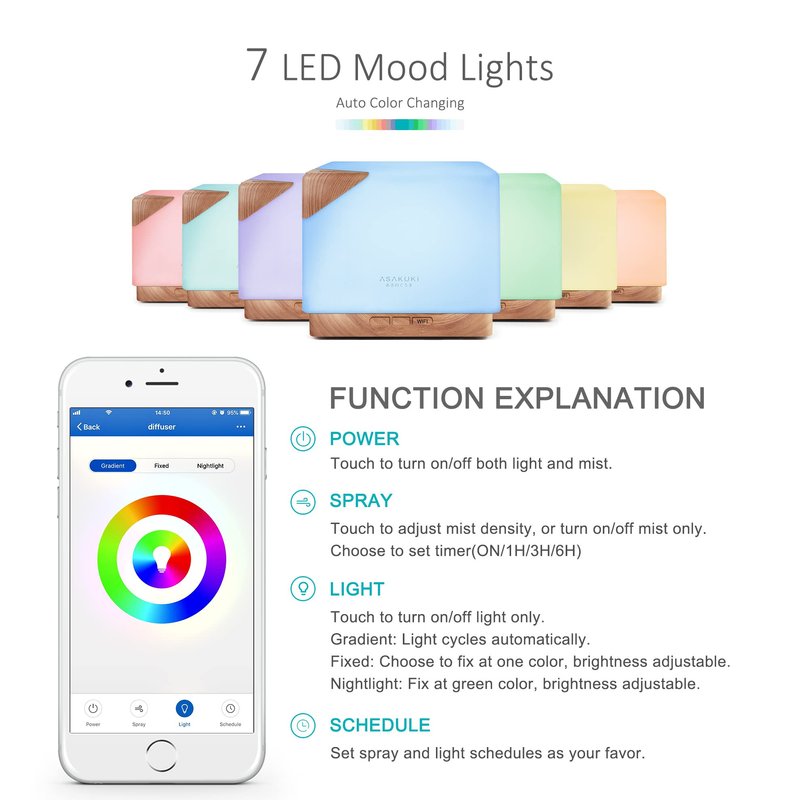 ASAKUKI Smart WiFi Essential Oil Aromatherapy Diffuser, Easy Connect with Alexa and Google Home Phone App Voice Control 700ml Ultrasonic Diffuser, Create Schedules 7 LED Colors Humidifier