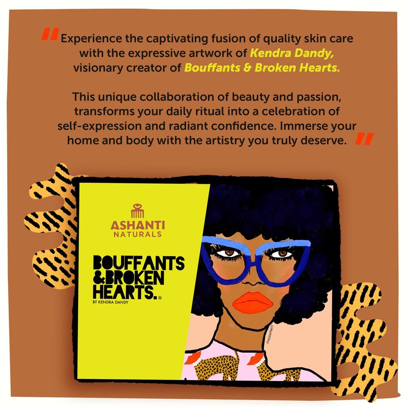 - Artful Skincare: Blend body and soul with Ashanti Naturals skin care products x Bouffants & Broken Hearts collaboration. Elevate self-care with a harmonious fusion of exquisite skincare and captivating art. Discover a new level of indulgence with our black soap African shea butter body wash cleanser!