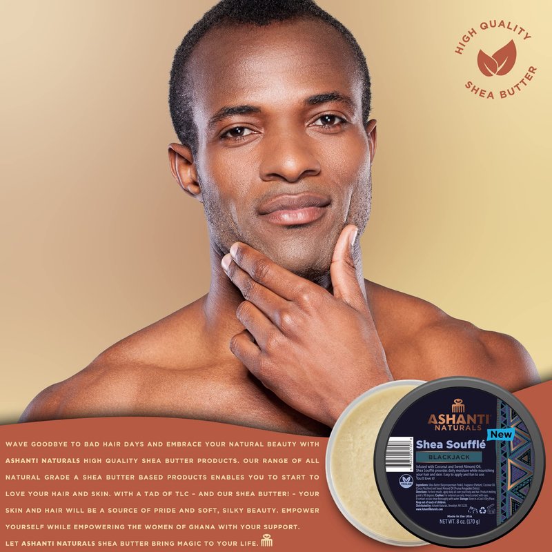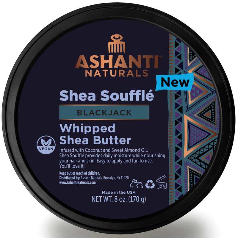 - Natural Indulgence - Bring out your body's natural beauty with Ashanti Naturals Shea Soufflé Blackjack. 8 oz of natural shea butter infused with coconut and sweet almond oil with an added masculine fragrance for the ultimate experience.