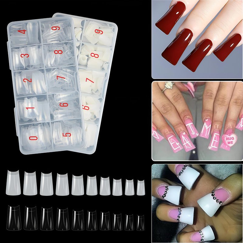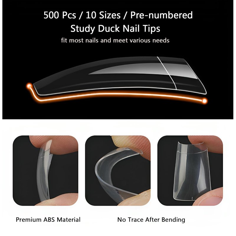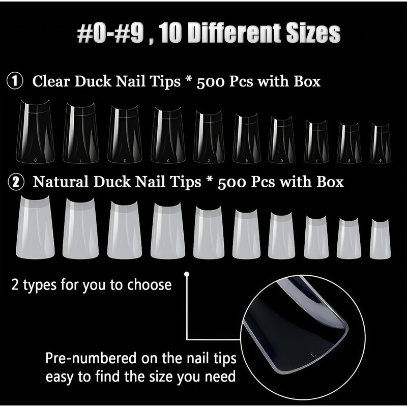 - Package Included - You will receive a box of 500 Pcs natural pre-shaped duck nail tips in 10 sizes (50Pcs/size), These nail extensions can help you change your nail shape easily, and for easy decoration manicure of nail arts.