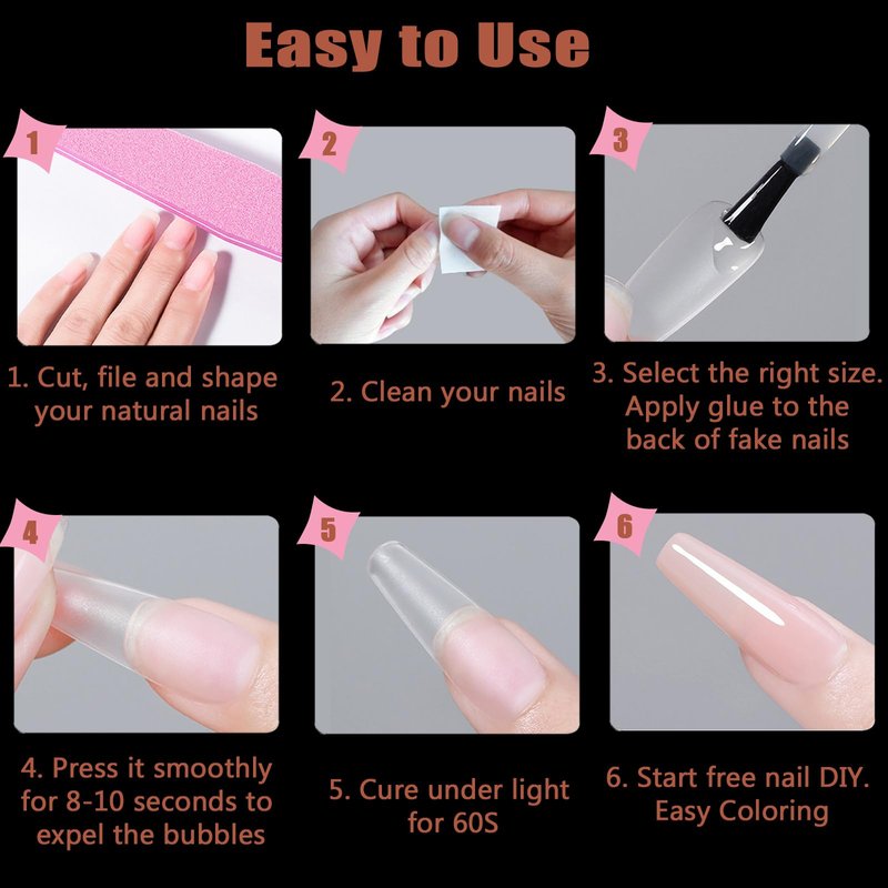 - Easy to Use - Full set natural fake nails tips with moderate length are super easy to fill and easy to apply. Which can provide you with a perfect and non-destructive salon nail manicure in a few minutes at home. And nice holds the color without separating or streaking. By pairing up paint and colorful decoration, your nails could be more charming.