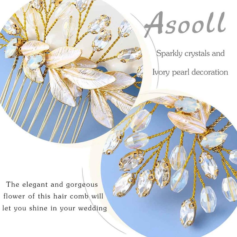 Asooll Bride Wedding Hair Comb Gold Leaf Rhinestone Bridal Hair Piece Crystal Hair Clip Hair Accessories for Women and Girls