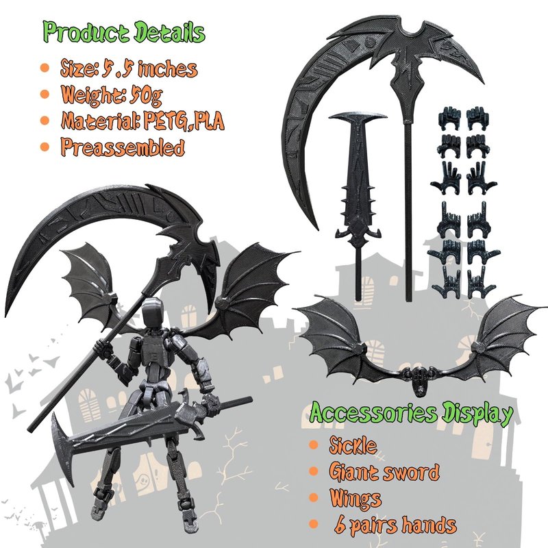 - 【Accessories】:Replace hands *6 pairs,T13 action figure *1,giant sword *1,sickle *1,wings *1