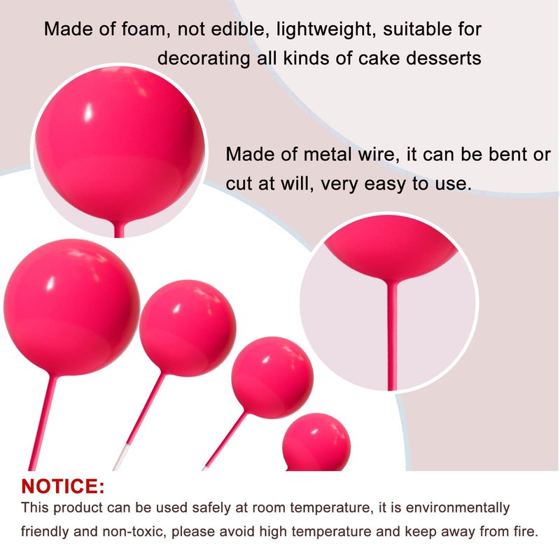 Specifications: Material: foam and wire. Color: hot pink. Size: diameters are 0.79 inch/ 2 cm, 0.98 inch/ 2.5 cm, 1.18 inches/ 3 cm, 1.57 inches/ 4 cm, 5 pieces of each size. Features: smooth surface, bright color, the balloon cake topper is full finished, does not require assembly, and can be inserted directly into the cake without additional tools, and saving time. ​Package Includes: 20 pcs hot pink ball cake toppers decorations in 4 sizes.