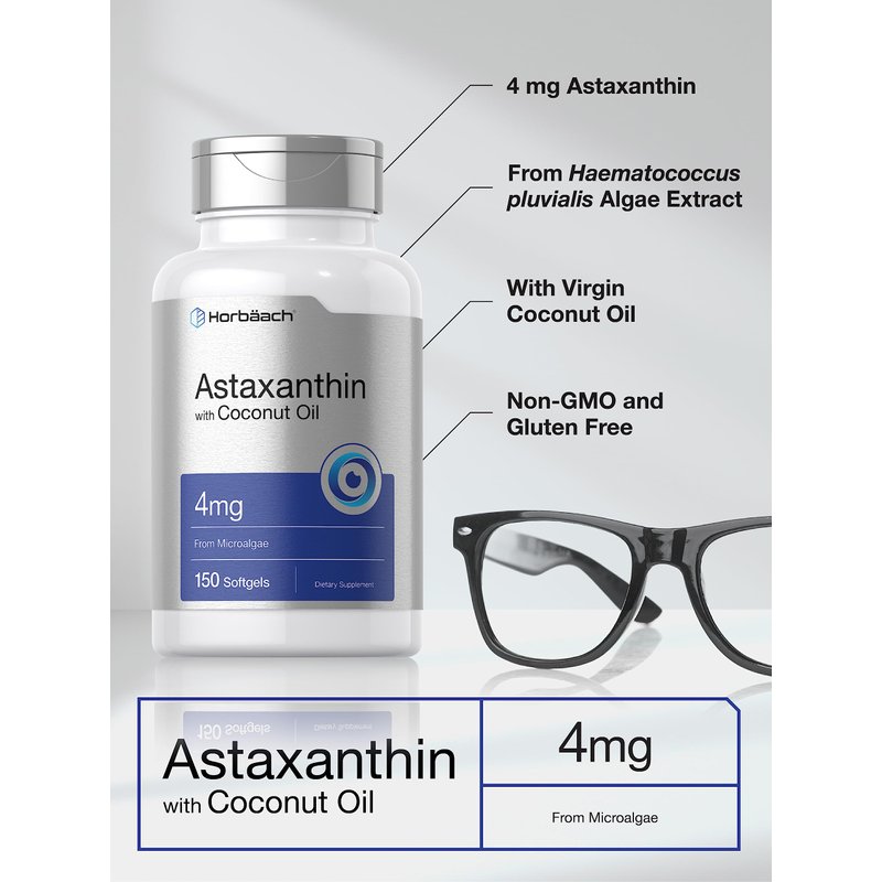 Astaxanthin 4mg | 150 Softgels | with Coconut Oil | Supplement from Microalgae | Non-GMO, Gluten Free | by Horbaach