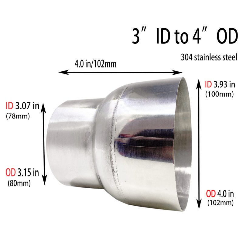 1. Made of high strength stainless steel material,high strength for maximum durability. 2. Precise design, good performance and high stability. 3. Great for custom turbo kits or exhaust systems that require specific sized pipings. 4. Universal fit for all exhaust/turbo/intercooler/intake piping connection. (Installation should depend on the inside diameter and outside size)Please refer to the dimension drawing to check the component size before purchasing. 5. 3inch to 4inch,2.25inch to 2.5inch,2inch ton 2.5inch,stable performance and high reliability. Four categories of Adapter/Reducers: