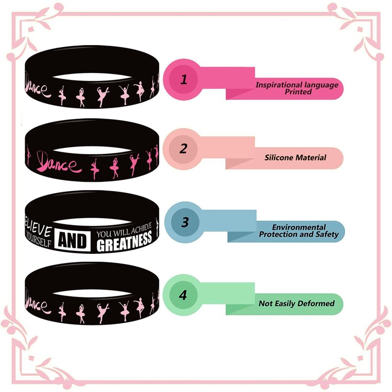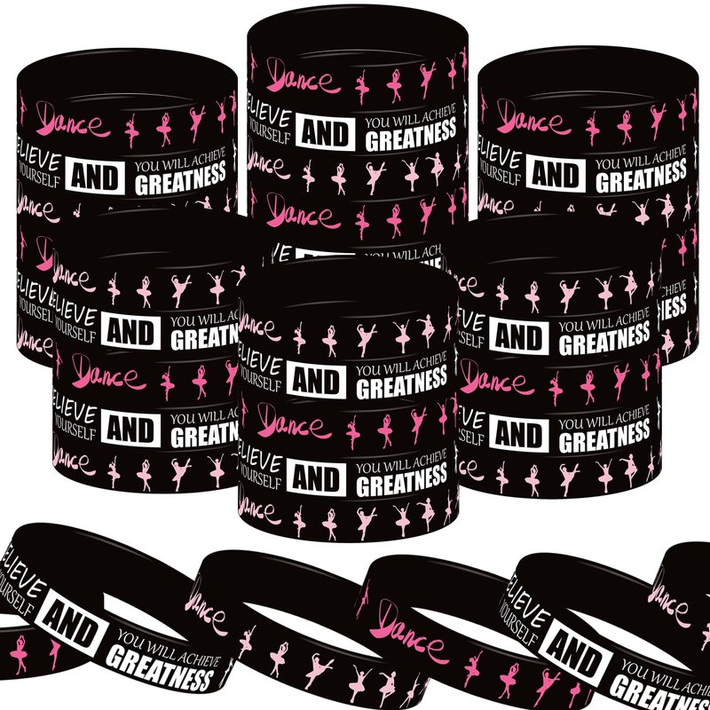 - The package includes 48 packs of rubber bracelets printed with an image of ballet posture and the words "Dance" and "Believe in yourself and you will achieve greatness". Each pack is sufficient to share with classmates and friends.