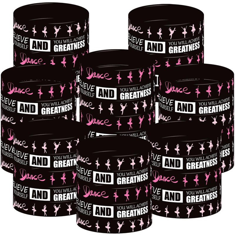 The package includes 48 packs of rubber bracelets printed with an image of ballet posture and the words "Dance" and "Believe in yourself and you will achieve greatness". Each pack is sufficient to share with classmates and friends.