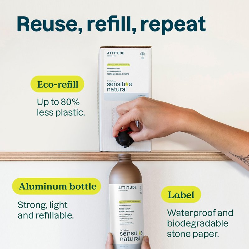 ATTITUDE Gentle Hand Soap for Sensitive Skin, EWG Verified, Enriched with Oats, Dermatologically Tested, Vegan, Unscented, Aluminum Bottle, 16 Fl Oz