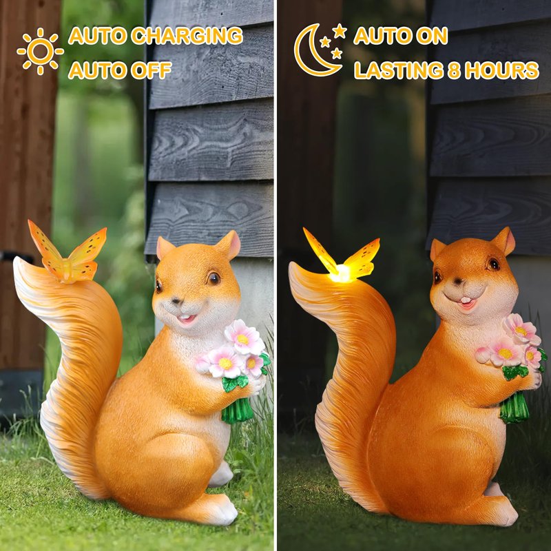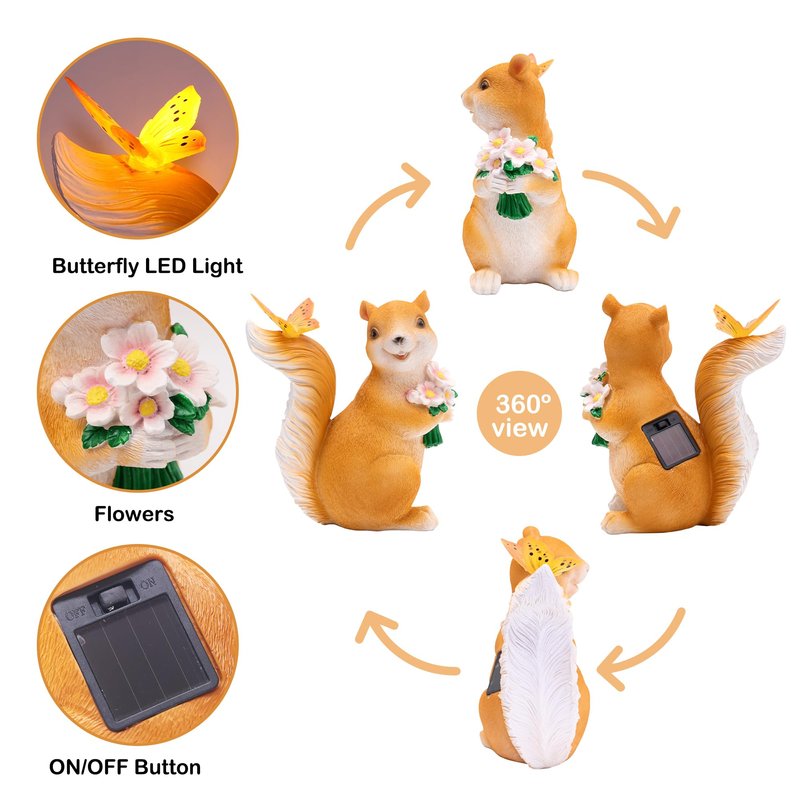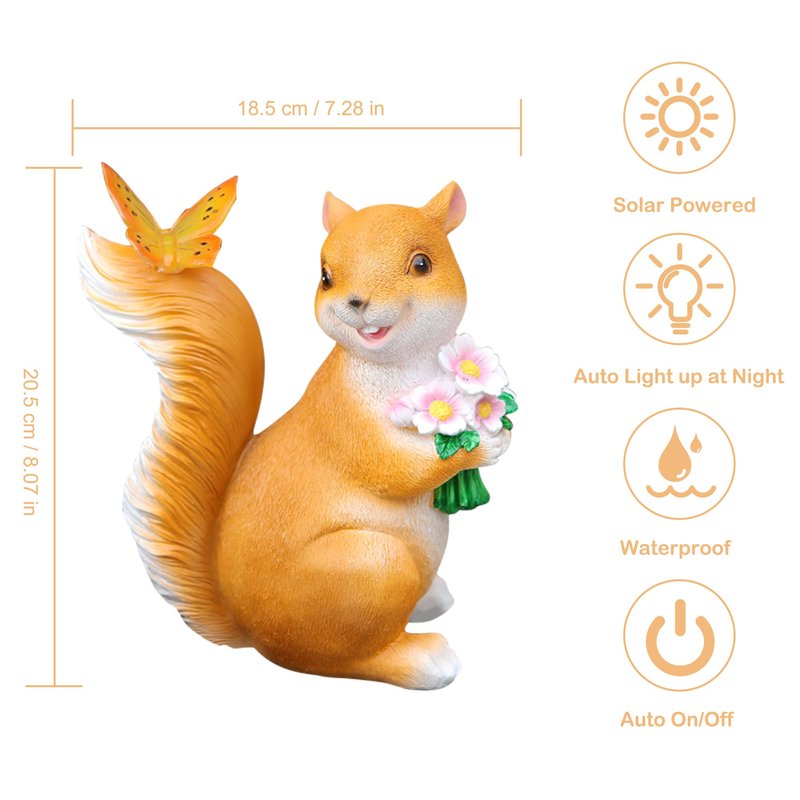 - 【Cute Garden Decor】Squirrel solar statue is a great decoration for garden/ balcony/ patio/ yard/ lawn/ fence/ walkway, the unique standing squirrel with flowers in hand and the butterfly rests on the tail of the squirrel will make you smile every time you look at them
