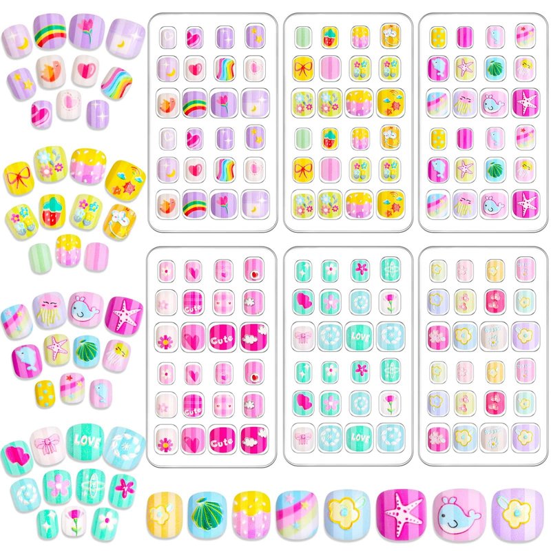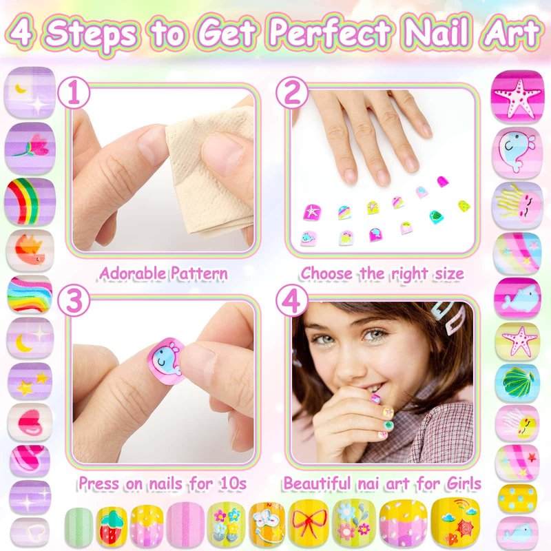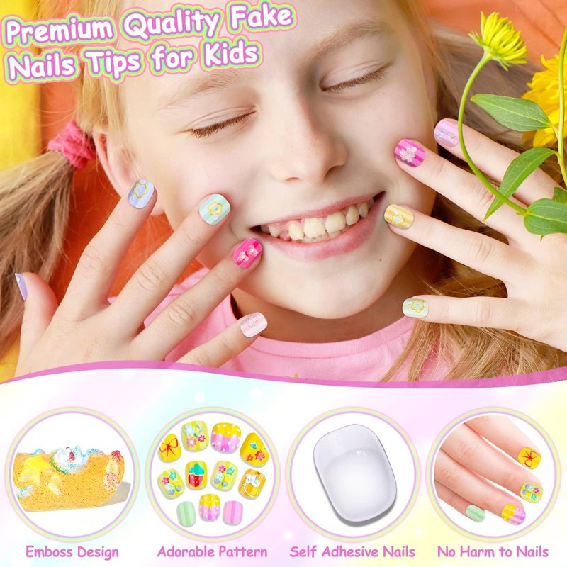- Press on Nails for Kids - Audab little girls fake nails kit contains 144 pcs kids stick on nails in assorted sizes and patterns. kids press on nails are a great gift for girls 7-12 on Christmas, New Year’s Day, parties, birthdays and more