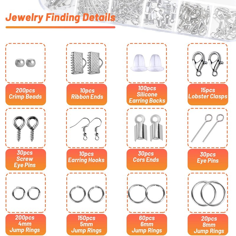 - Jewelry Finding Supplies – With inclusion of 12 different kinds of jewelry findings of open jump rings (4mm, 5mm, 6mm, 8mm), lobster clasps, eye pins, screw eye pins, crimp beads, earring hooks, ribbon ends, cord ends and rubber earring back, each kind of finding is packed separately in a box container