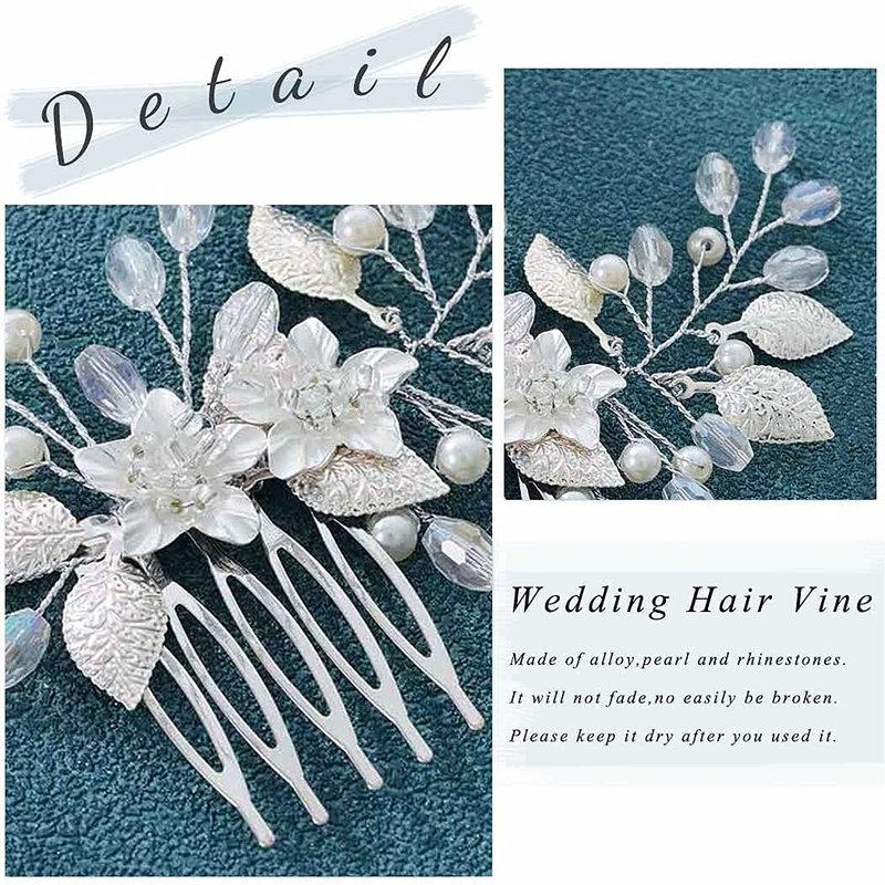 Aukmla Leaf Bride Wedding Hair Comb Flower Bridal Hair Pieces Rhinestones Side Comb Hair Accessories for Women and Girls (Pack of 2) (Silver)