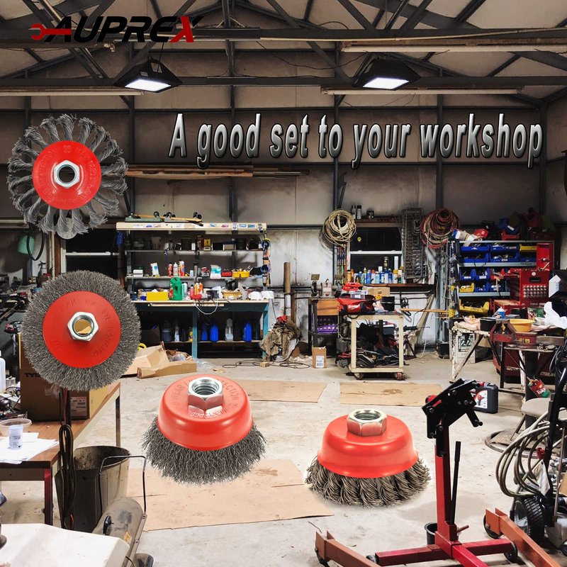 The AUPREX 4 PCS wire wheel and cup brushes are used for removing rust, corrosion, scales, burrs and paint on metals. It can be used for both light duty and heavy duty conditioning work.