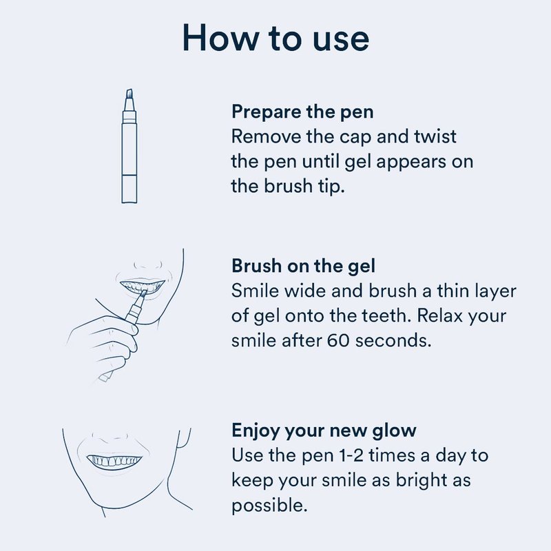 Smile wide, twist the pen to expose the gel onto the brush and paint onto each tooth. After 1 minute, relax your smile and the gel will whiten your teeth without any sensitivity. The soft brush bristles allow you to precisely whiten each tooth and get into crevices so you are left with an all-round white smile. Repeat use 1-2 times per day for best results and avoid eating or drinking for 1 hour for best results.