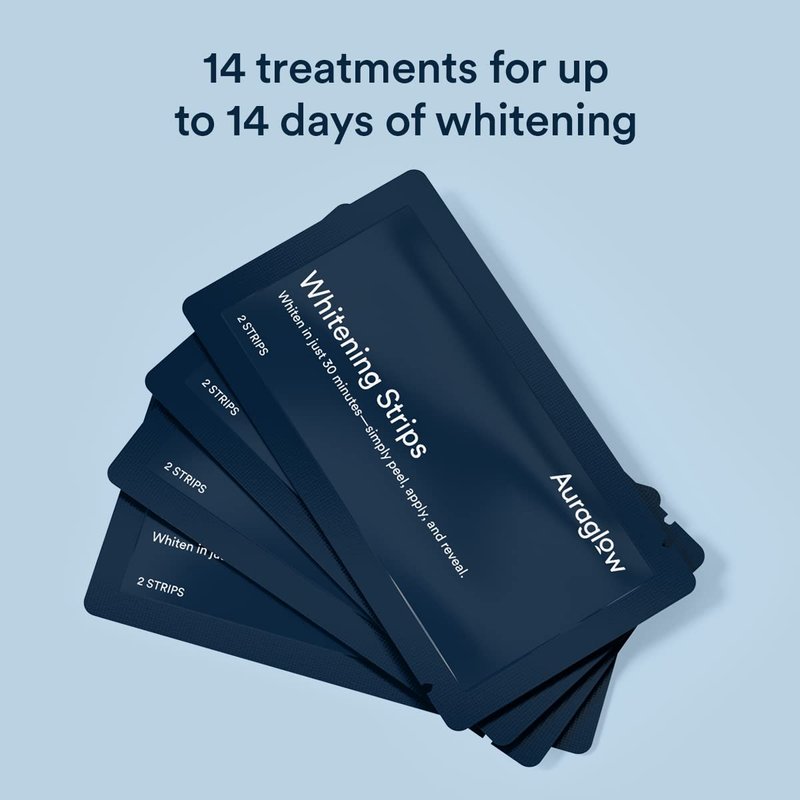 Auraglow teeth whitening strips are the fastest way to whiten your teeth at home. The whitening strips include hydrogen peroxide formula that lifts stains off the teeth from coffee, tea, wine, smoking, soda and more. Simply peel the strips from the backing and apply to the upper and lower teeth. Wear for 30 minutes, then remove to reveal a brighter smile. The teeth whitening strips include 28 strips and 14 treatments to rapidly whiten your teeth at home like the dentist in just 30 minutes. These whitening strips are professional-level whitening strips that remove up to 14 years of stains. Our whitening strips are safe for enamel, sensitivity free and proven to whiten the teeth while removing yellow tooth stains. Choose Auraglow whitestrips, the #1 dentist-recommended at-home teeth whitening brand and get 100% noticeably whiter teeth.