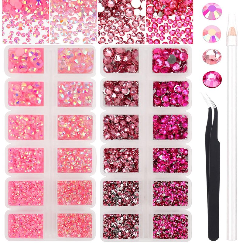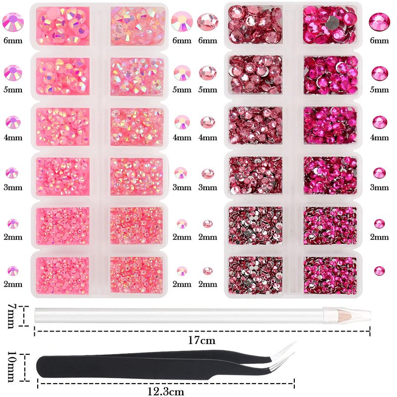 AUREHEN 15000PCs 2-6MM Pink Series Resin Flat Back Rhinestones, Round Non Hotfix Jelly & Silver Bottom Resin Rhinestones Nail Gems Stones with Tweezer & Picker Pen for Nail Art Tumblers & DIY Crafts