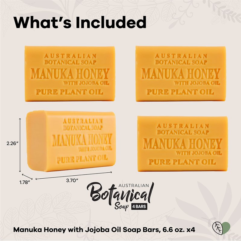 Australian Botanical Soap, Manuka Honey with Jojoba Oil 6.6 oz. (187g) Soap Bars | Natural Ingredient Bar Soaps | All Skin Types | Shea Butter Enriched - 4 Count
