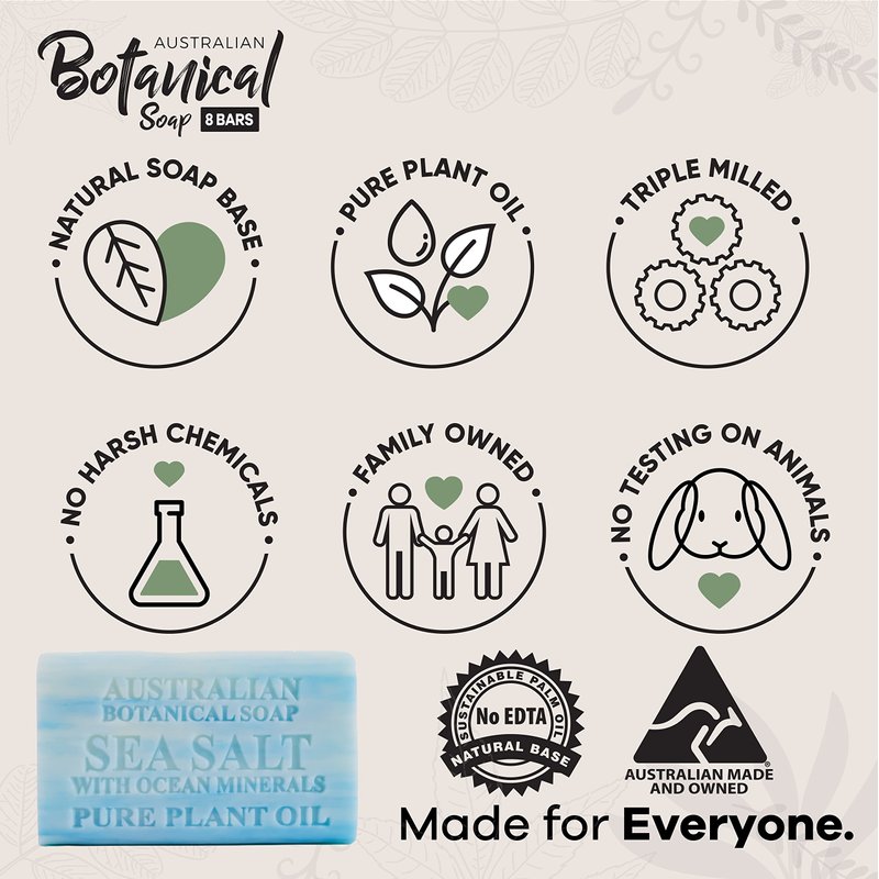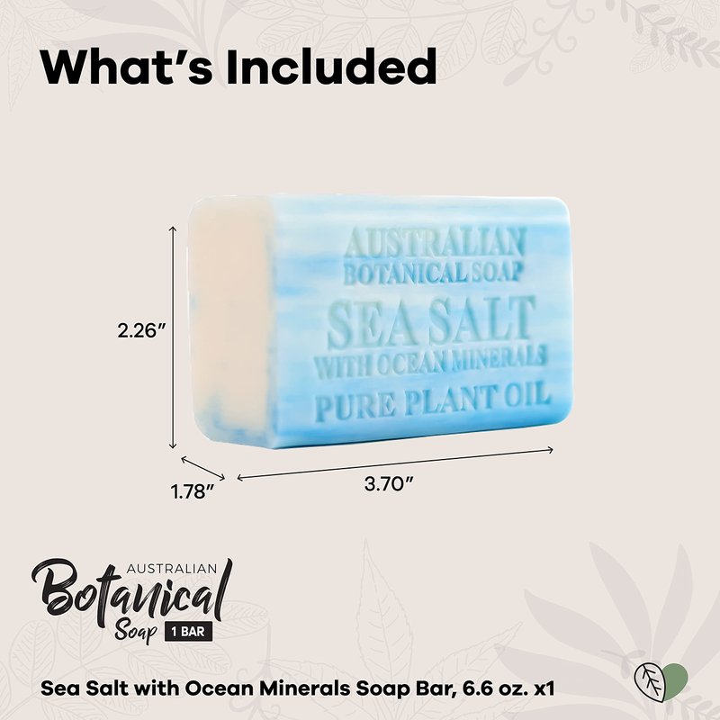 - Rich Ocean Minerals and Sea Salt - Australian Botanical Soap Sea Salt with Ocean Minerals provides a refreshing wash reminiscent of an early morning beach stroll. This Sea Salt soap is enhanced with rich mineral deposits found in the Camargue region of France and will work to visibly tone and soften the appearance of skin.