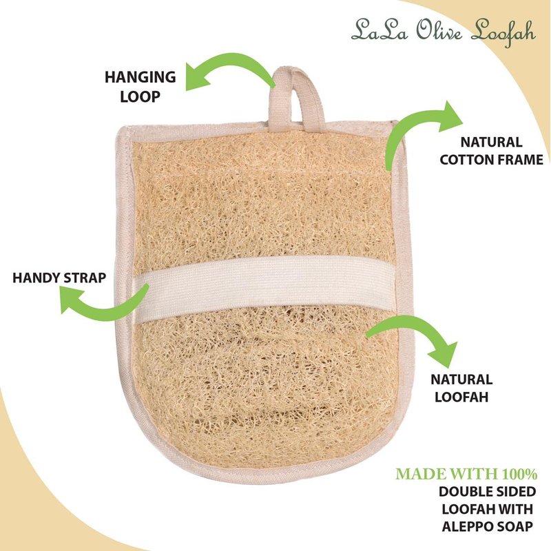 - 100% Natural Exfoliation Double-sided Loofah sponge (18 x 14cm) with 100 grams of Aleppo Soap Bar.