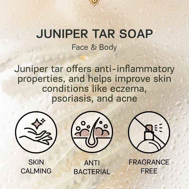 - THERAPEUTIC JUNIPER TAR - Infused with natural juniper tar oil, known for its skin-soothing and therapeutic properties, this soap is ideal for various skin conditions.