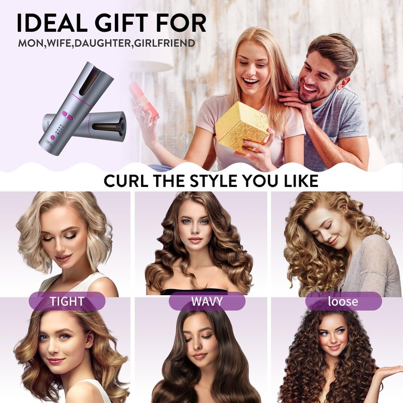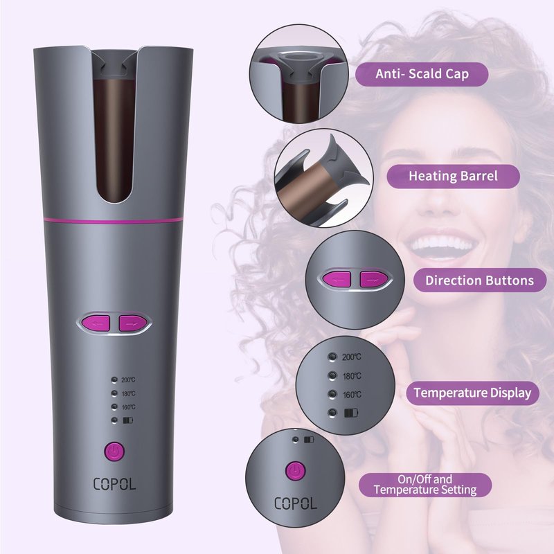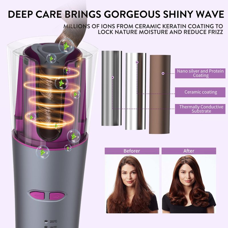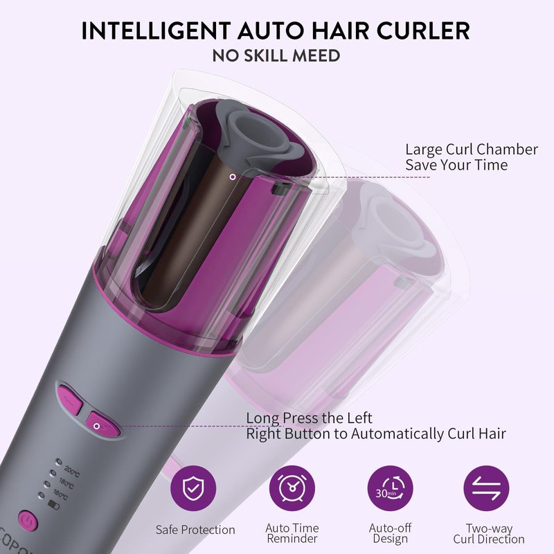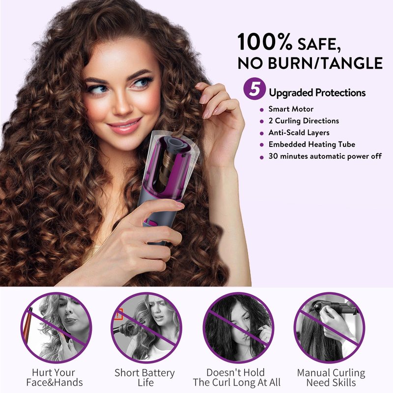 - Cordless Auto Hair Curler - The automatic curling iron has a U-shaped outer layer of heated tubes that are well-shielded from heat and are safer to the touch. Unlike traditional curling iron that snags or even burns hair, our curling iron is equipped with an intelligent sensor chip that automatically stops when it is not working properly. Curls hair in left and right direction and releases hair with just one button. No burns, no snags, safer to use.
