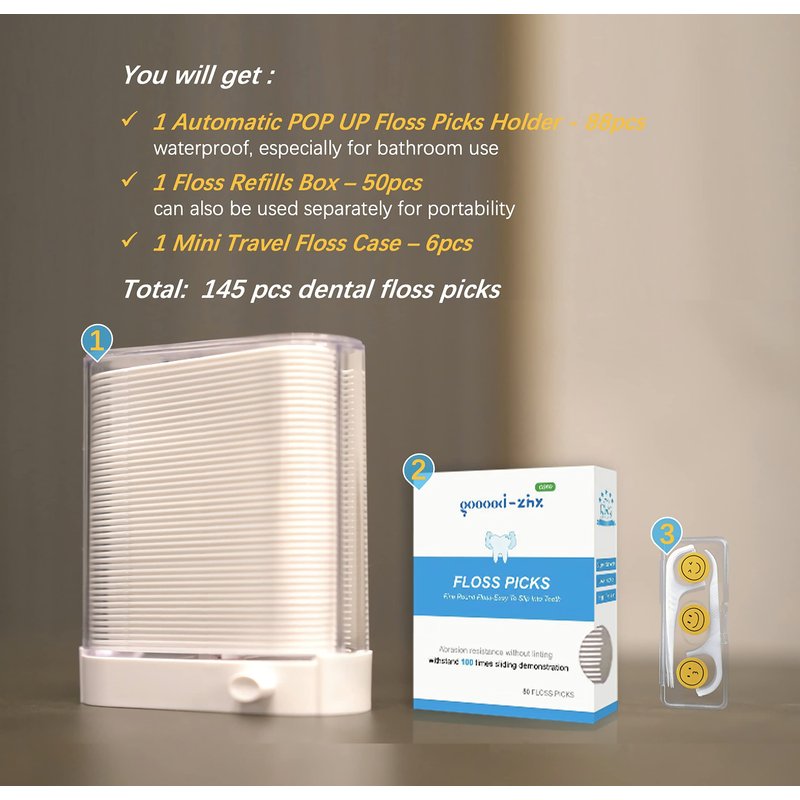 - GREAT VALUE SET - 1 Automatic Pop Up Floss Picks Holder. 1 Super Convenient Design Dental Floss Picks Refill Box. 1 Travel Mini Flosser Case.145 pieces of quality floss sticks in total.