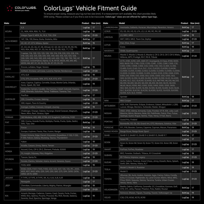 Colorlugs Vinyl lug nuts covers and bolt cap covers work on vehicles of all make and models