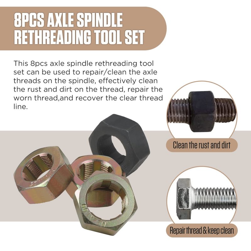 Axle spindle rethreading tool set can be used to repair/clean the axle threads on the spindle, effectively clean the rust and dirt on the thread, repair the worn thread,and recover the clear thread line. It is the best tool for cleaning axle threads.