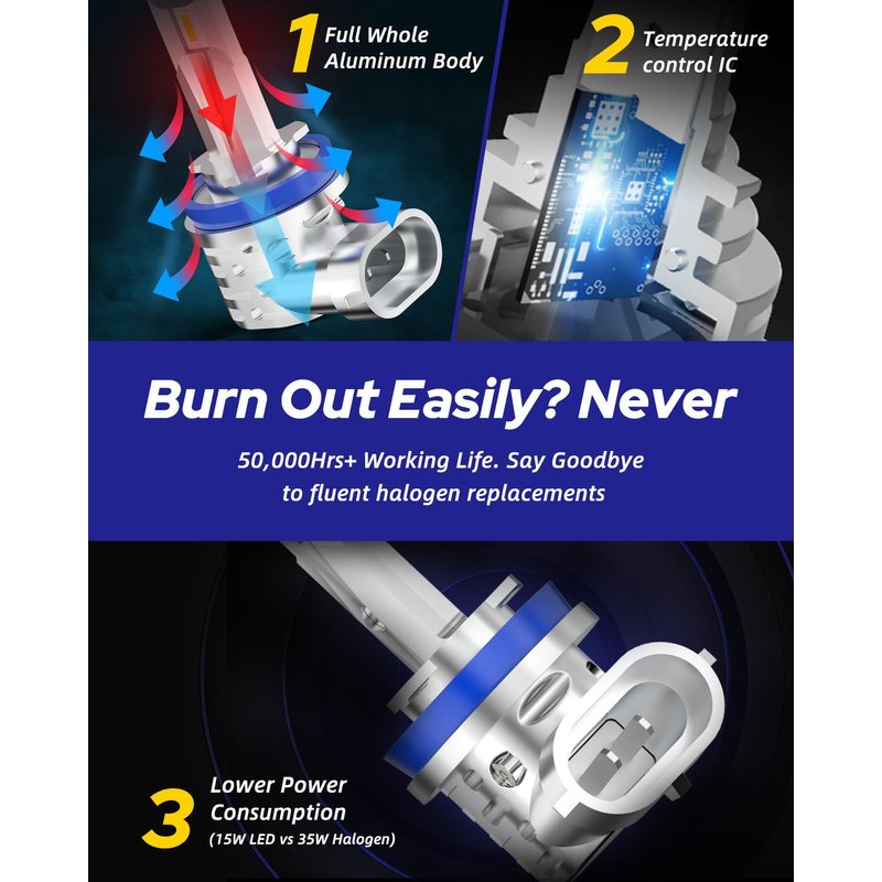 - 【50000+ Hours Lifespan】-Top-grade aviation aluminum heat sink design and intelligent temp control for heat dissipation ensure H8 LED fog lights much longer lifespan up to 50000 hours