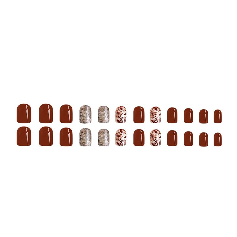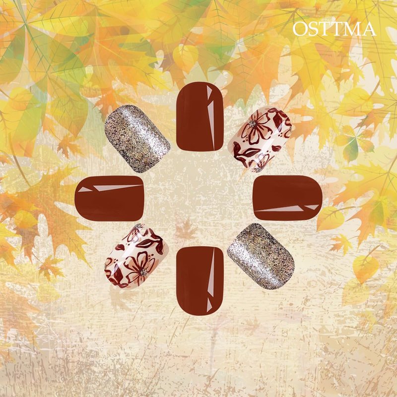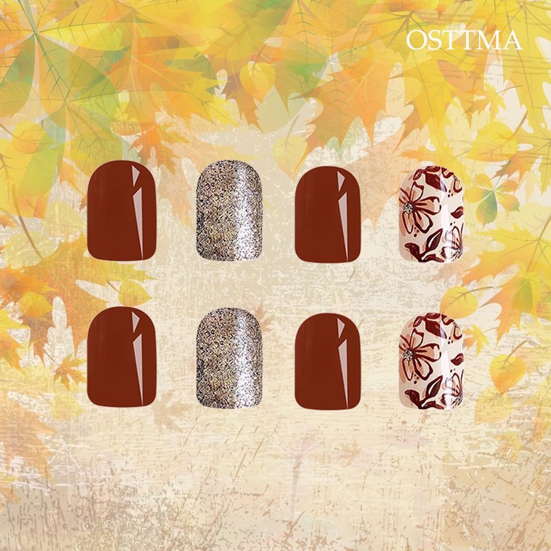 Autumn Press on Nails Short Square Fall Flower Fake Nails Brown Solid Color Glitter False Nails with Designs Full Cover Floral Glue on Nails Reusable Stick on Nails for Women DIY Fall Nails Art,24Pcs