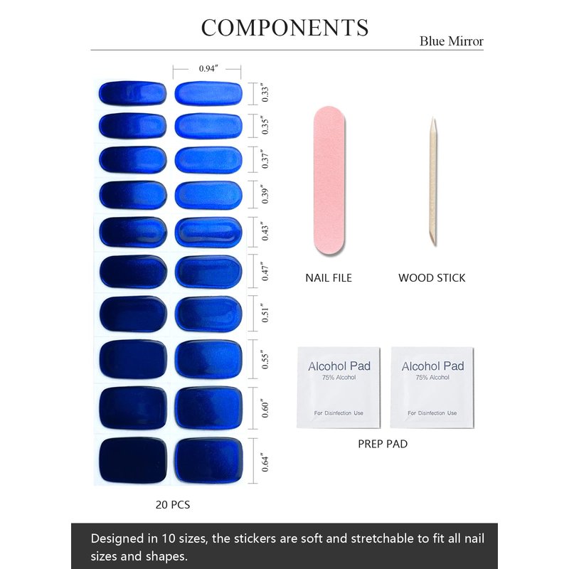 - 【Nail Art Stickers Set】- Each box comes with 20 gel nail strips in 10 different sizes for the perfect match. It also comes with 2 prep pads, 1 nail file, and 1 wooden stick.