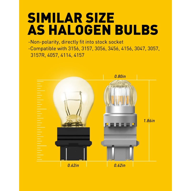- 【Directly Fit & Multi Application】Non-polarity, those amber 3157 bulb can be used for turn signal lights, blinker lights, side marker lights, etc. Compatible with socket 3156, 3157, 3056, 3356, 3456, 4156, 3047, 3057, 3155, 3157A, 3357, 3457, 3457A, 4057, 4114, 4157 etc.