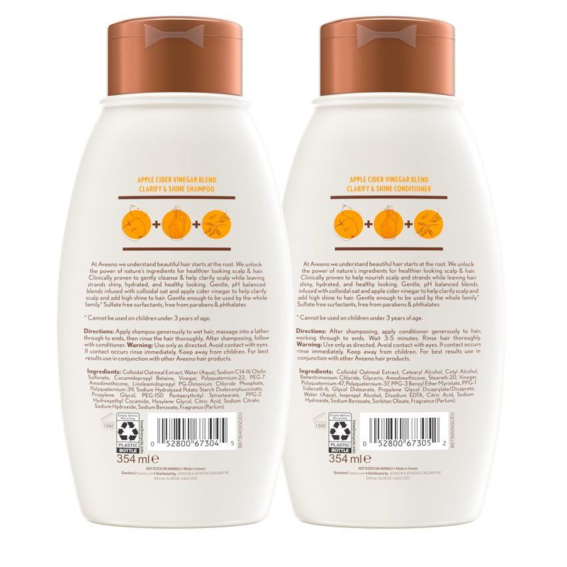 Aveeno Apple Cider Vinegar Shampoo + Conditioner for Balance & High Shine, Daily Clarifying & Soothing Scalp Shampoo for Oily or Dull Hair, Paraben & Dye-Free, 12 Fl Oz
