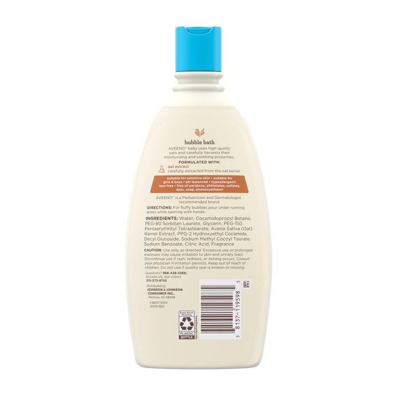 Aveeno Baby Sensitive Skin Bubble Bath with Oat Extract, Gently Cleanses and Leaves Skin Feeling Hydrated, Tear-Free Formula, Hypoallergenic, Paraben-, Phthalate-, Soap- & Dye-Free, 19.2 fl. Oz