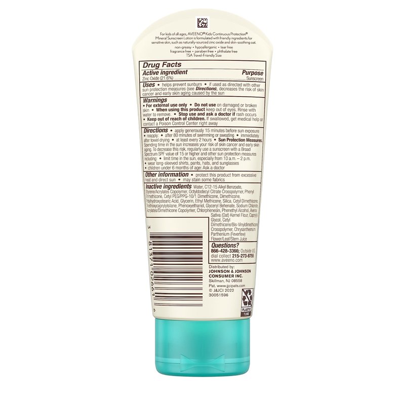 - 3-fluid ounce travel-size tube of Aveeno Kids Continuous Protection Sensitive Skin Sunscreen Lotion with broad spectrum SPF 50 for superior protection from harmful UVA and UVB rays for your child's skin