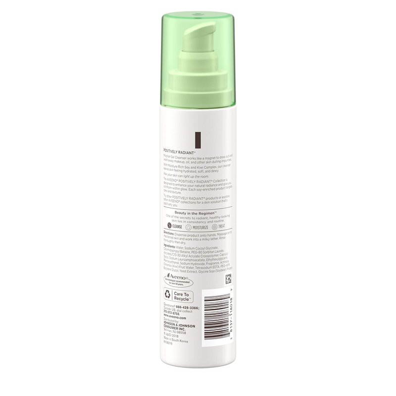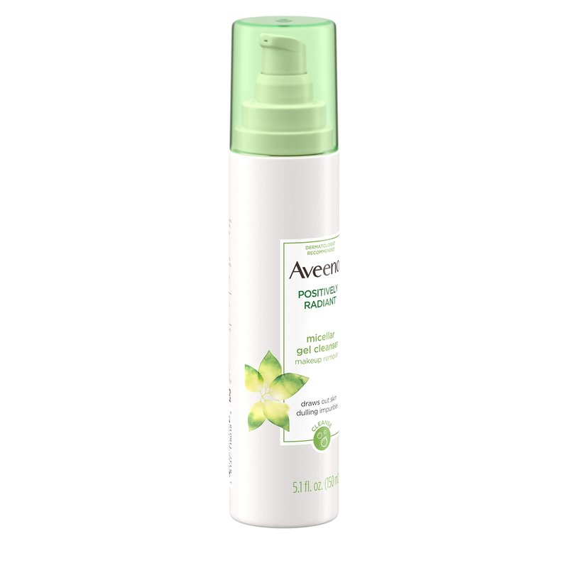 Enhance your skin's natural radiance with Aveeno Positively Radiant Micellar Gel Cleanser. From a dermatologist-recommended brand, this gel facial cleanser works like a magnet to draw out and wash away makeup, oil, and other skin-dulling impurities. With moisture-rich soy and kiwi complex, its unique formula is designed to attract and lock in moisture, leaving skin feeling hydrated, soft, and dewy. The hydrating gel cleanser is hypoallergenic, paraben-free, phthalate-free and non-comedogenic, which means it won't clog pores. The Aveeno Positively Radiant Collection is designed to enhance your natural radiance and give you a lit-from-within glow. Each soy enriched product targets tone and texture. Try other Positively Radiant products for a skin solution that's positively you. 5.1-fl. oz bottle of Aveeno Positively Radiant Micellar Gel Cleanser Hydrating facial cleanser gently washes away makeup, oil and other skin dulling impurities Specially formulated to attract and lock in moisture to leave skin feeling soft and dewy Micellar facial cleanser and makeup remover is designed to help enhance skin's natural radiance With moisture-rich soy and kiwi complex, it helps skin feel hydrated, soft and supple Hypoallergenic, paraben-free and phthalate-free, and non-comedogenic, so it won't clog pores Gel facial cleanser is from the brand that has been dermatologist-recommended for over 65 years Part of the Aveeno Positively Radiant collection to help give skin a lit-from-within glow