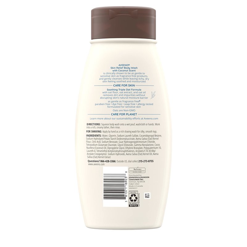 - 18-fluid ounce bottle of Aveeno Skin Relief Body Wash with a gentle coconut scent designed for sensitive skin with a Triple Oat formula leaves itchy, dry skin soothed and feeling moisturized all day