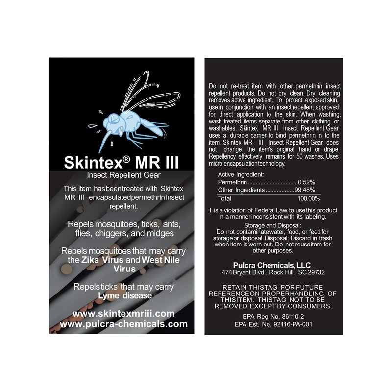 - INSECT REPELLENT: InsectGuard comes pretreated with a powerful microencapsulated permethrin insect repellent (Skintex MRIII) and is Registered to repel mosquitoes, ticks, ants, flies, chiggers and/or midges. The treatment process provides a KNOCKDEAD effect for insects when they come in contact with it and provides effective, odorless insect protection Registered to last to 50 washes.
