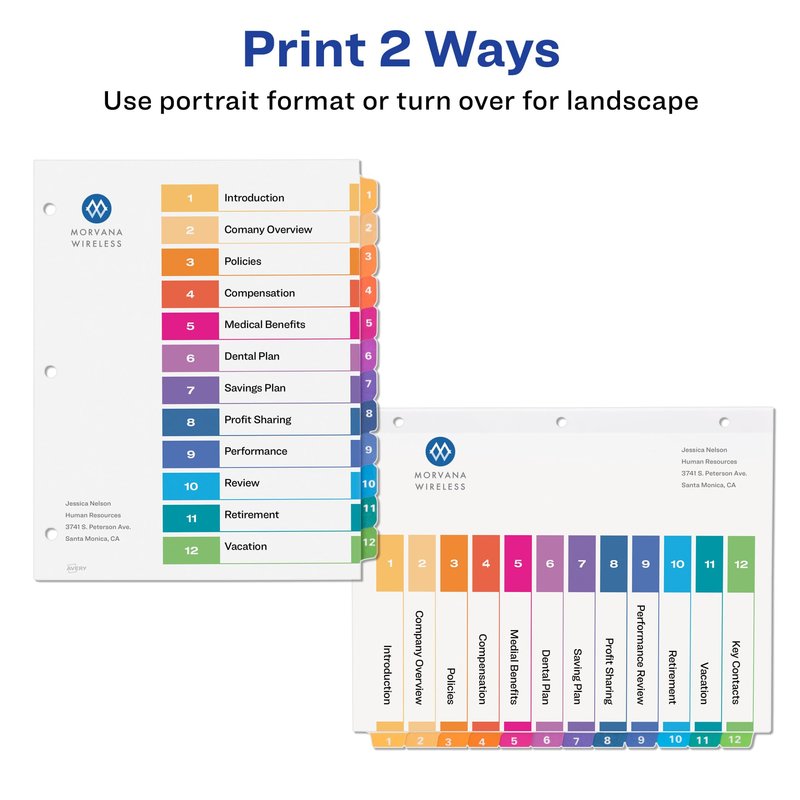 Avery 12 Tab Dividers for 3 Ring Binders, Customizable Table of Contents, Multicolor Tabs, 6 Sets (11196)
